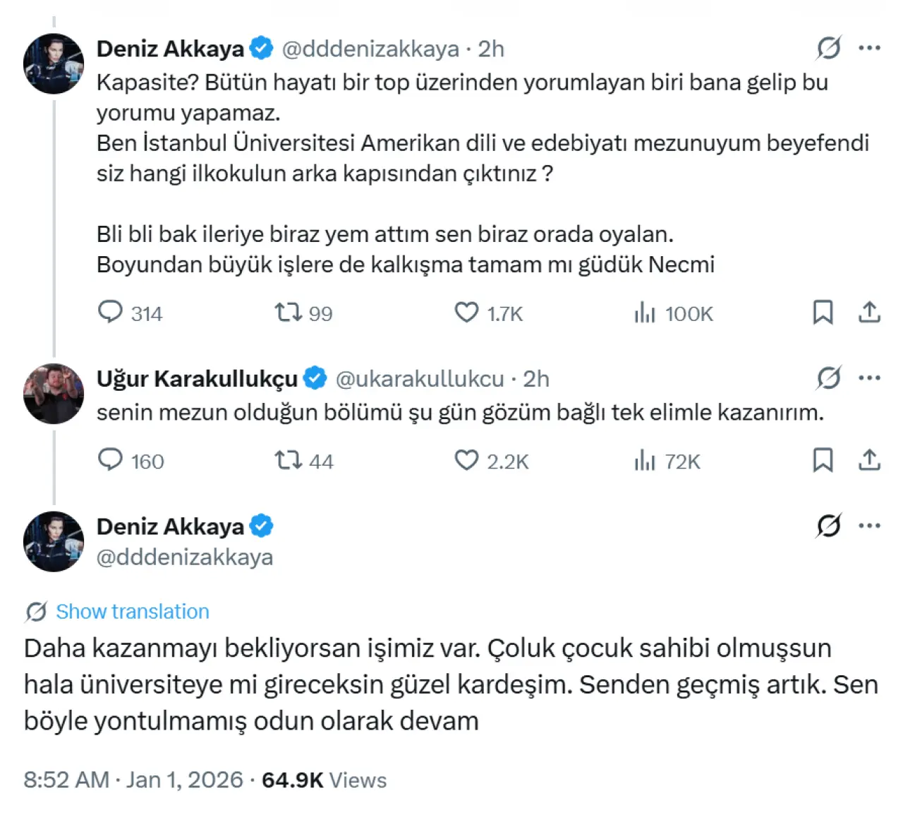 Deniz Akkaya, "Kapasite? Bütün hayatı bir top üzerinden yorumlayan biri bana gelip bu yorumu yapamaz. Ben İstanbul Üniversitesi Amerikan Dili ve Edebiyatı mezunuyum beyefendi, siz hangi ilkokulun arka kapısından çıktınız? Boyundan büyük işlere kalkışma tamam mı Güdük Necmi" diyerek tartışmayı alevlendirdi.