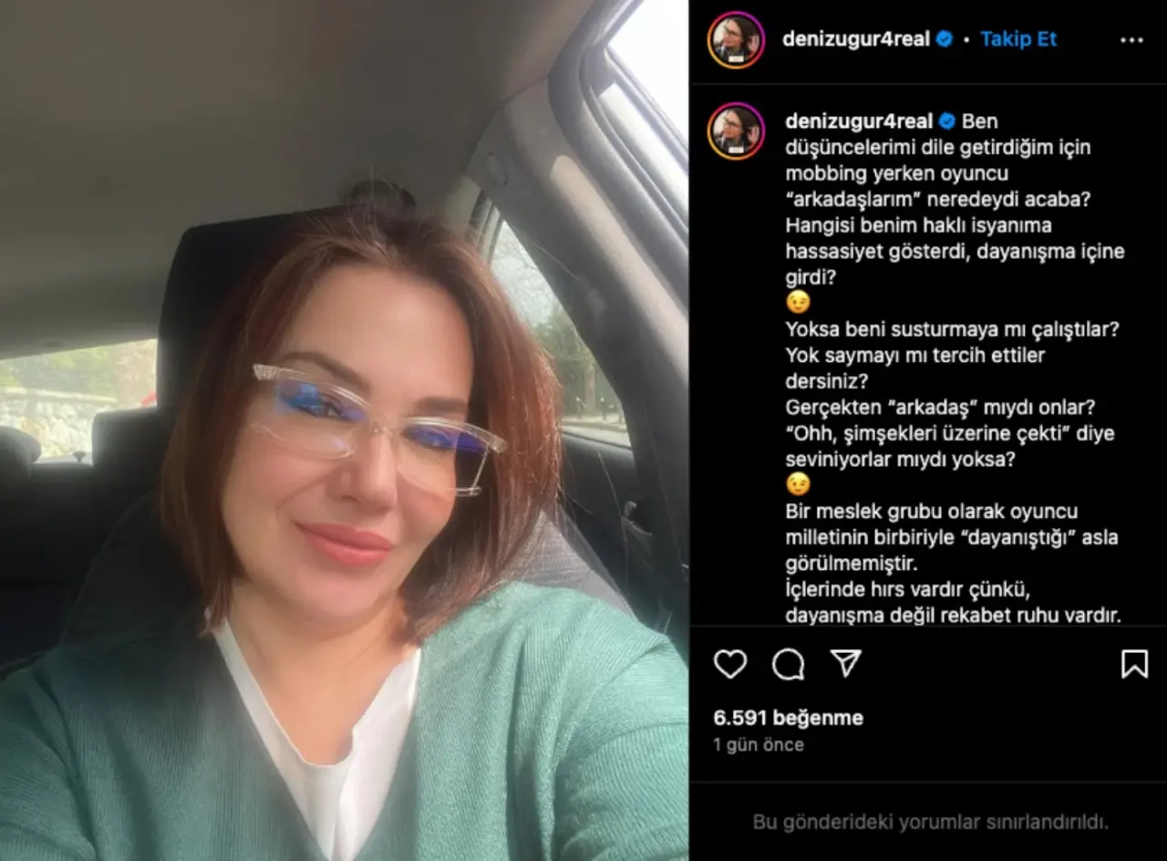 “Ben düşüncelerimi dile getirdiğim için mobbing yerken oyuncu arkadaşlarım(!) neredeydi acaba? Hangisi benim haklı isyanıma hassasiyet gösterdi, dayanışma içine girdi?