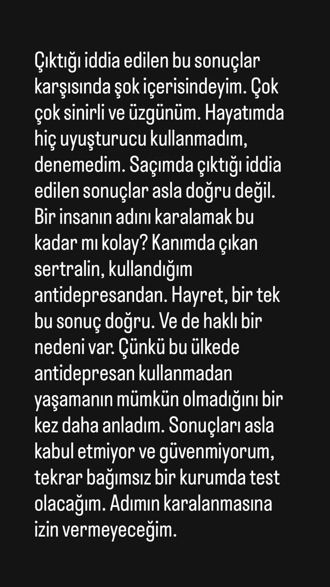 “Şok içerisindeyim. Hayatımda hiç uyuşturucu kullanmadım. Sonuçlar asla doğru değil. Bir insanın adını karalamak bu kadar kolay mı? Bir tek kanımda çıkan sertralin sonucu doğru, kullandığım antidepresan. Bu ülkede antidepresan kullanmadan yaşamanın mümkün olmadığını bir kez daha anladım. Sonuçları asla kabul etmiyorum. Tekrar bağımsız bir kurumda test olacağım. Adımın karalanmasına izin vermeyeceğim.”