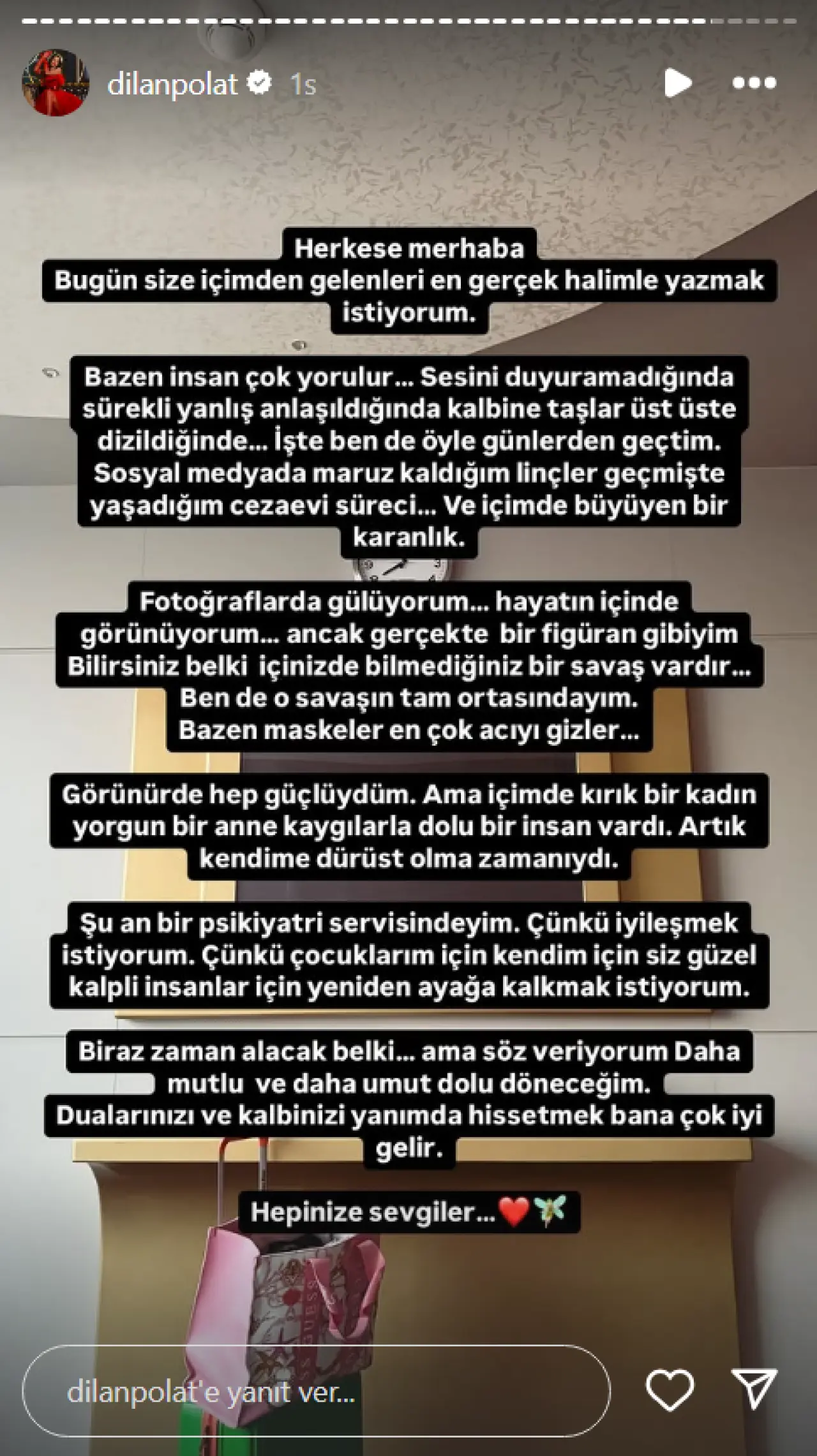 Lüks hayatıyla gündemden düşmeyen Dilan Polat, bu kez iç dünyasını gözler önüne serdi. Psikiyatri servisinden yaptığı paylaşımda, yaşadığı çöküşü, acılarını ve yeniden ayağa kalkma umudunu anlattı. EKT tedavisi mi görüyor?