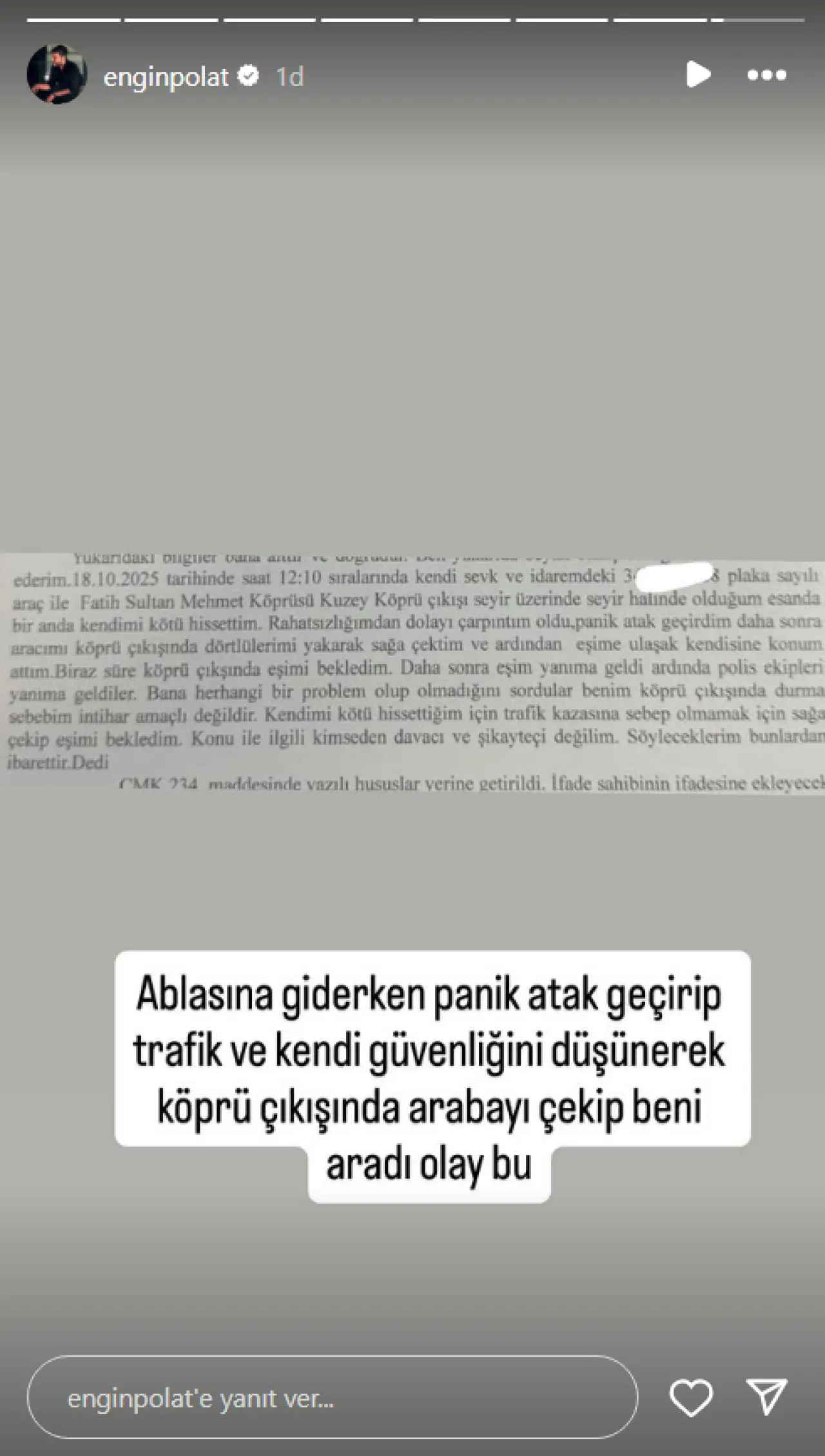 Engin Polat ise iddiaları reddederek sosyal medya hesabından yaptığı açıklamada, “Ablasına giderken panik atak geçirip trafiği ve kendini tehlikeye atmamak için aracını kenara çekip beni aradı, olay bu” ifadelerini kullandı.