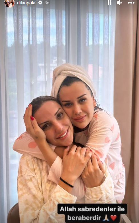 Eve dönen Sıla Doğu ile sarılarak poz veren Dilan Polat, "Allah sabredenlerle beraberdir" notunu ekledi.