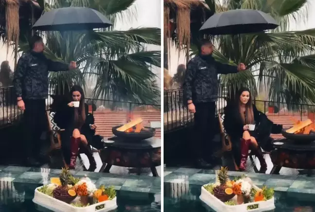 Polat'ın yayınlanan videosunda ateş başında kahve keyfi yaptığı bu sırada korumasına şemsiye tutturduğu görüldü. Polat'ın videosu tepki çekti.