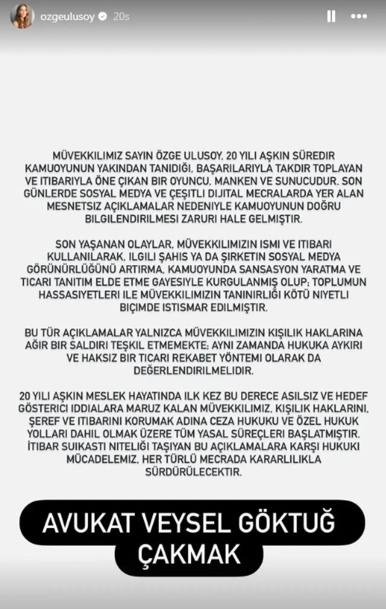 “Müvekkilimiz Sayın Özge Ulusoy, 20 yılı aşkın süredir başarıları ve duruşuyla kamuoyunun takdirini kazanmış, saygın bir sanatçıdır. Son günlerde sosyal medyada yer alan mesnetsiz iddialar, bir itibar suikastidir. Bu olay, ilgili kişi ya da şirketin sosyal medya görünürlüğünü artırma ve ticari kazanç elde etme amacıyla kurgulanmış, müvekkilimizin tanınırlığı kötü niyetli şekilde istismar edilmiştir.”