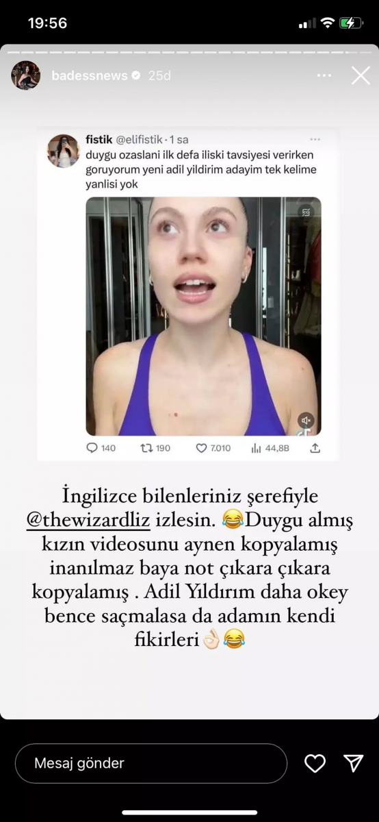"Erkeklere trip atmak yerine hiç cevap vermeyin, buluşmayın ve hikaye yanıtlarını açmayın. Ona ihtiyacınız yok, bonus gibi düşünün" diyen Duygu Özaslan videosunda YouTube'da kişisel gelişim, mental sağlık, ilişki tavsiyeleri ve nicesi hakkında konuşan 'thewizardliz' isimli kullanıcıya özendiği iddia edildi.