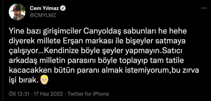 “Yine bazı girişimciler Canyoldaş sabunları he hehe diyerek millete Erşan markası ile bişeyler satmaya çalışıyor…Kendinize böyle şeyler yapmayın. Satıcı arkadaş milletin parasını böyle toplayıp tam tatile kaçacakken bütün paranı almak istemiyorum, bu zırva işi bırak."