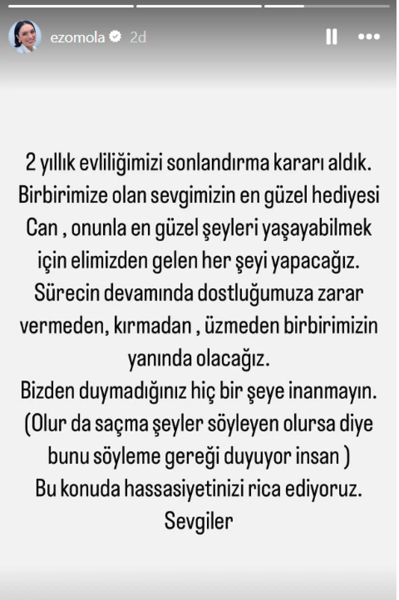 “2 yıllık evliliğimizi sonlandırma kararı aldık. Birbirimize olan sevgimizin en güzel hediyesi Can, onunla en güzel şeyleri yaşayabilmek için elimizden gelen her şeyi yapacağız. Sürecin devamında dostluğumuza zarar vermeden, kırmadan, üzmeden birbirimizin yanında olacağız.