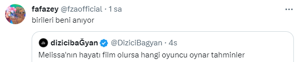 "Melissa'nın hayatı film olursa hangi oyuncu oynar tahminler" tweetine biyografi filmlerin aranan yüzlerinden Farah Zeynep Abdullah esprili bir şekilde en çok ismi yazılan oyuncu oması üzerine oyuncudan “Birileri beni anıyor” şeklinde yanıt geldi.