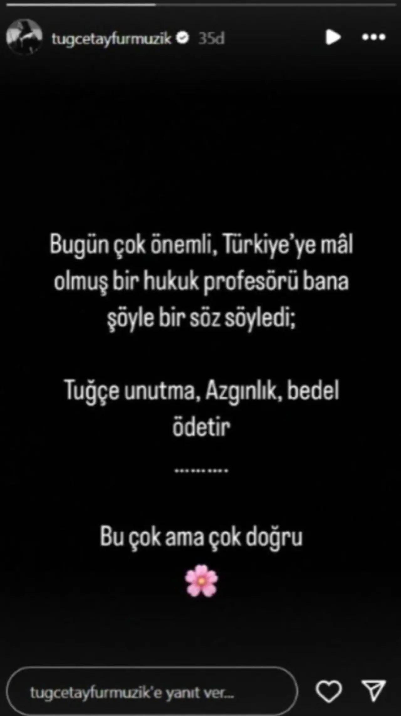 Tuğçe Tayfur, daha sonra dikkat çeken bir paylaşım yaparak şu ifadeleri kullandı: "Bugün çok önemli, Türkiye'ye mâl olmuş bir hukuk profesörü bana şöyle bir söz söyledi: 'Tuğçe unutma, azgınlık bedel ödetir.' Bu çok ama çok doğru."