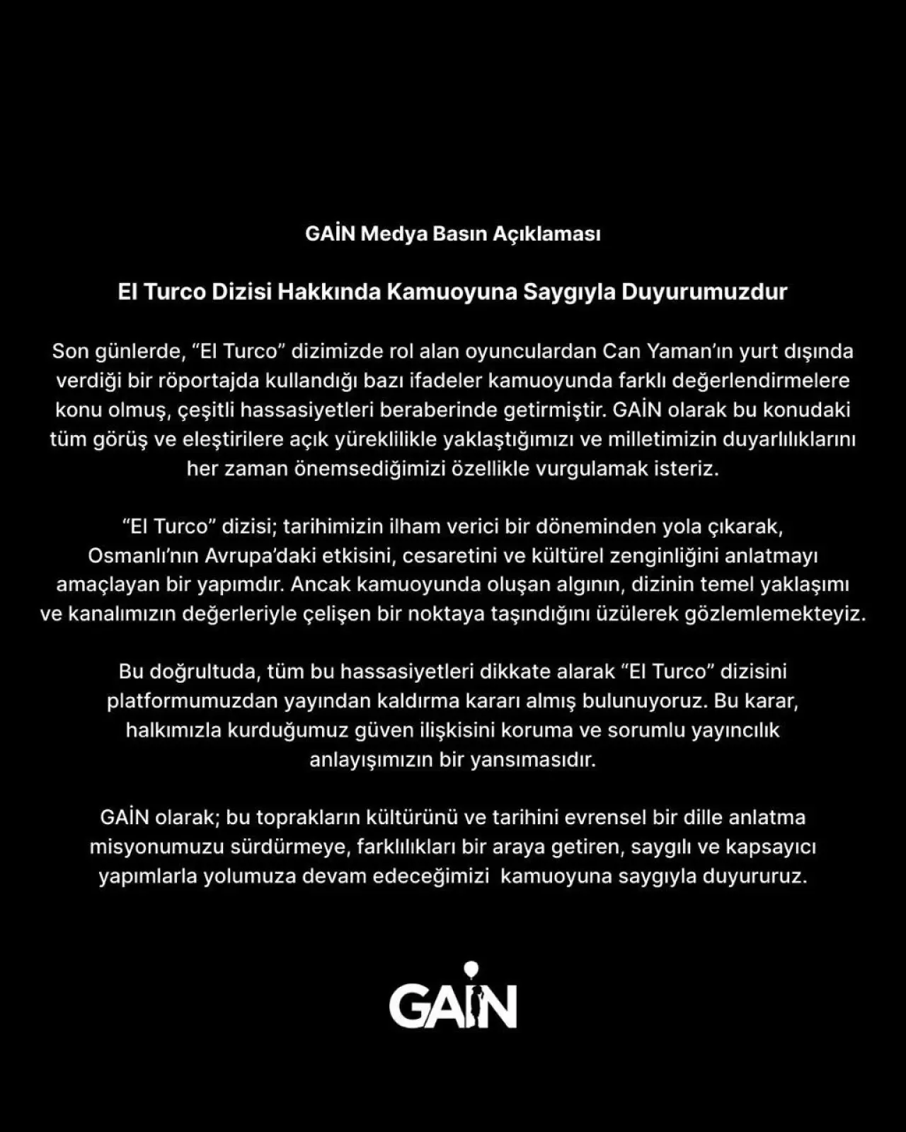 "Son günlerde ‘El Turco’ dizimizde rol alan oyunculardan Can Yaman’ın yurtdışında verdiği bir röportajda kullandığı bazı ifadeler kamuoyunda farklı değerlendirmelere konu olmuş, çeşitli hassasiyetleri beraberinde getirmiştir. GAİN olarak bu konudaki tüm görüş ve eleştirilere açık yüreklilikle yaklaştığımızı ve milletimizin duyarlılıklarını her zaman önemsediğimizi özellikle vurgulamak isteriz.