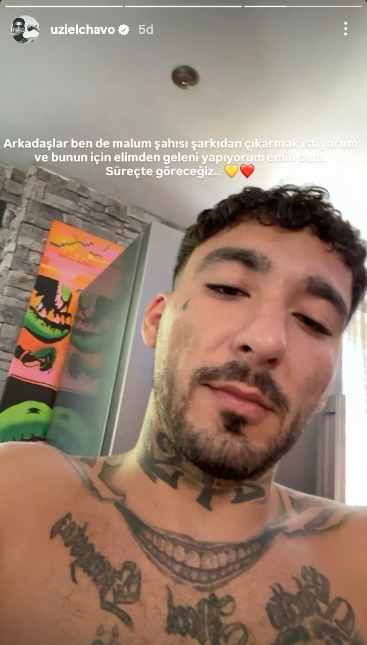 Uzi, paylaşımında, “Arkadaşlar ben de malum şahsı şarkıdan çıkarmak istiyorum ve bunun için elimden geleni yapıyorum, emin olun. Süreçte göreceğiz” ifadelerini kullandı. Paylaşımına sarı kırmızı kalp emojilerini de ekledi.