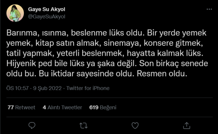 Gaye Su Akyol, Twitter hesabından "her şeyin" lüks olmasına tepki gösterdi. Hayat pahalılığının sorumlusu olarak iktidarı gösteren Akyol'un paylaşımı şöyle: