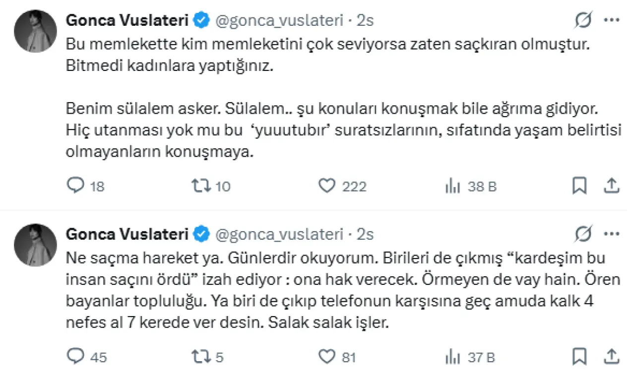 Sosyal medya hesabından art arda paylaşımlar yapan Vuslateri, akımı sert ifadelerle eleştirdi. Ünlü oyuncu, “Ne saçma hareket ya. Günlerdir okuyorum. Birileri de çıkmış ‘kardeşim bu insan saçını ördü’ diye izah ediyor. Örmeyen de vay hain. Ören bayanlar topluluğu… Salak salak işler” sözleriyle tepkisini dile getirdi.