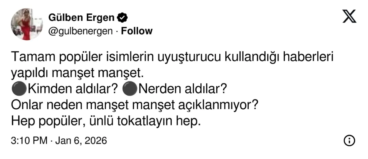 Gelişmelerin ardından sosyal medya hesabından paylaşım yapan Ergen, haberlerde sürekli ünlü isimlerin ön plana çıkarılmasına tepki gösterdi. “Hep ünlüleri tokatlayın” ifadesini kullanan Ergen, asıl sorgulanması gerekenin uyuşturucu maddelerin kimler tarafından ve nereden temin edildiği olduğunu vurguladı.