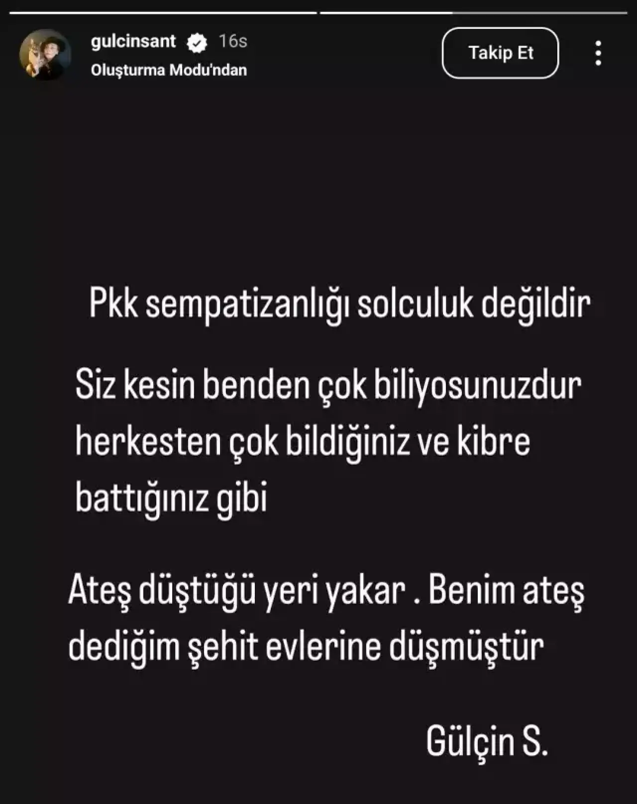 Son dönemde "Yalı Çapkını" dizisindeki İfakat rolüyle ekrana gelen oyuncu Gülçin Santırcıoğlu, sosyal medya hesabından yaptığı siyasi içerikli paylaşımıyla gündeme oturdu. Toplumsal konulara dair yaptığı çıkışla dikkat çeken oyuncu, özellikle terörle mücadele ve ideolojik duruşlar hakkında net bir mesaj verdi.