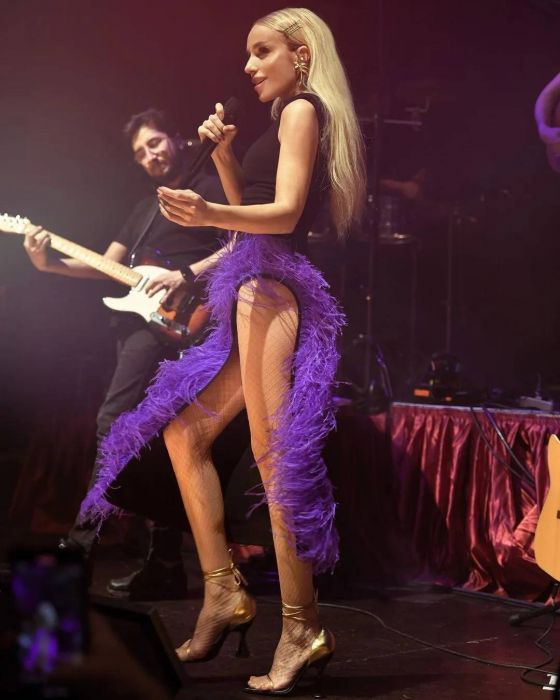 Dekolteli, mor püsküllü elbisesi ve file çoraplarıyla göz kamaştıran Gülşen yine kendinden bahsettirmeyi başardı.