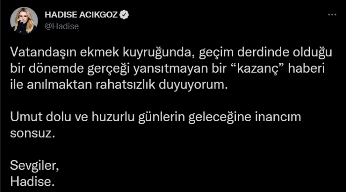 “Vatandaşın ekmek kuyruğunda, geçim derdinde olduğu bir dönemde gerçeği yansıtmayan bir “kazanç” haberi ile anılmaktan rahatsızlık duyuyorum. Umut dolu ve huzurlu günlerin geleceğine inancım sonsuz. Sevgiler.”