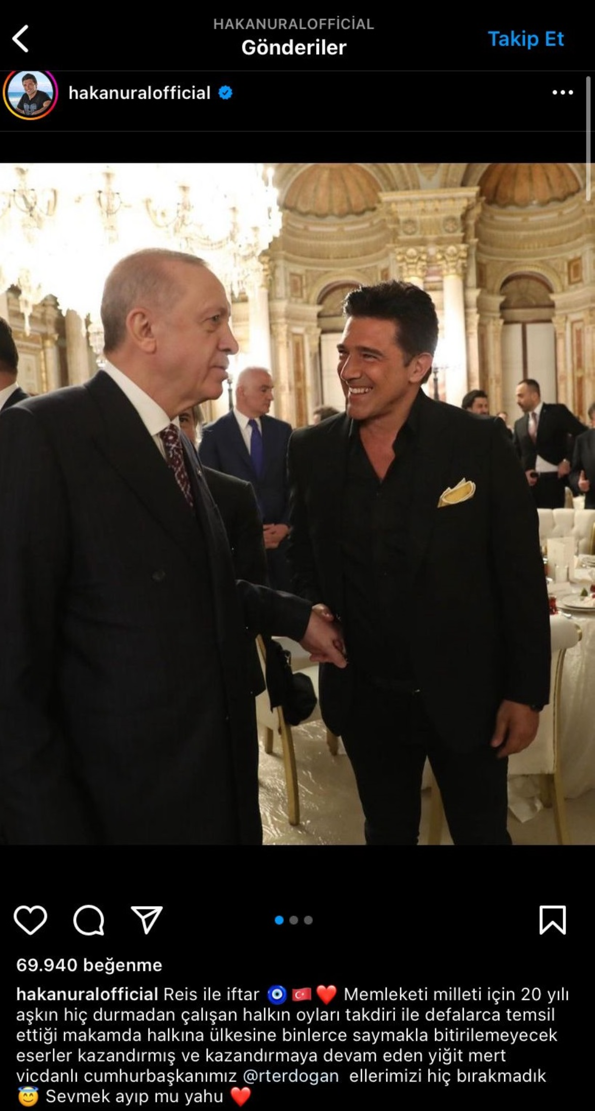 AKP'li Cumhurbaşkanı Recep Tayyip Erdoğan'ın geçtiğimiz günlerde Dolmabahçe Sarayı'nda düzenlediği Iftar programında yer alan Hakan Ural fotoğraflar paylaşıp, "Reis ile iftar. Memleketi milleti için 20 yılı aşkın hiç durmadan çalışan halkın oyları takdiri ile defalarca temsil ettiği makamda halkına ülkesine binlerce saymakla bitirilemeyecek eserler kazandırmış ve kazandırmaya devam eden yiğit mert vicdanlı cumhurbaşkanımız Erdoğan ellerimizi hiç bırakmadık. Sevmek ayıp mı yahu" dedi.