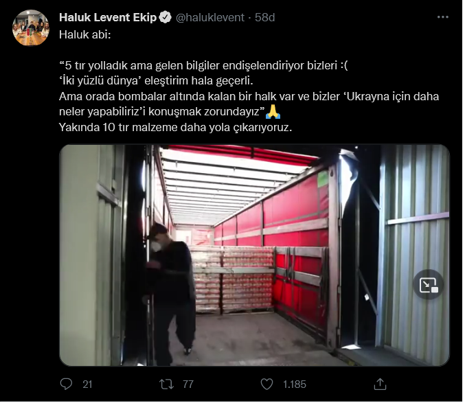 Haluk Levent, AHBAP derneğinin Rusya'nın işgali altındaki Ukrayna'ya 5 TIR insani yardım gönderdiğini açıklamıştı. Levent, bölgeden gelen bilgilerden dolay endişe duyduklarını ve Batı'nın iki yüzlülüğü eleştirisinin arkasında olduğunu belirterek, "Yakın 10 TIR malzeme daha yola çıkarıyoruz" dedi.