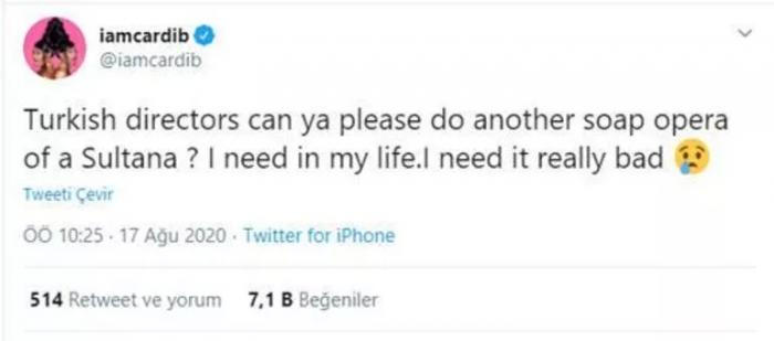 Cardi B., Muhteşem Yüzyıl'ın final bölümünü izledikten sonra Twitter üzerinden Türk yönetmenlere seslendi: "Türk yönetmenler, lütfen bir sultan dizisi daha yapar mısınız. Buna hayatımda ihtiyacım var. Gerçekten feci şekilde ihtiyacım var"