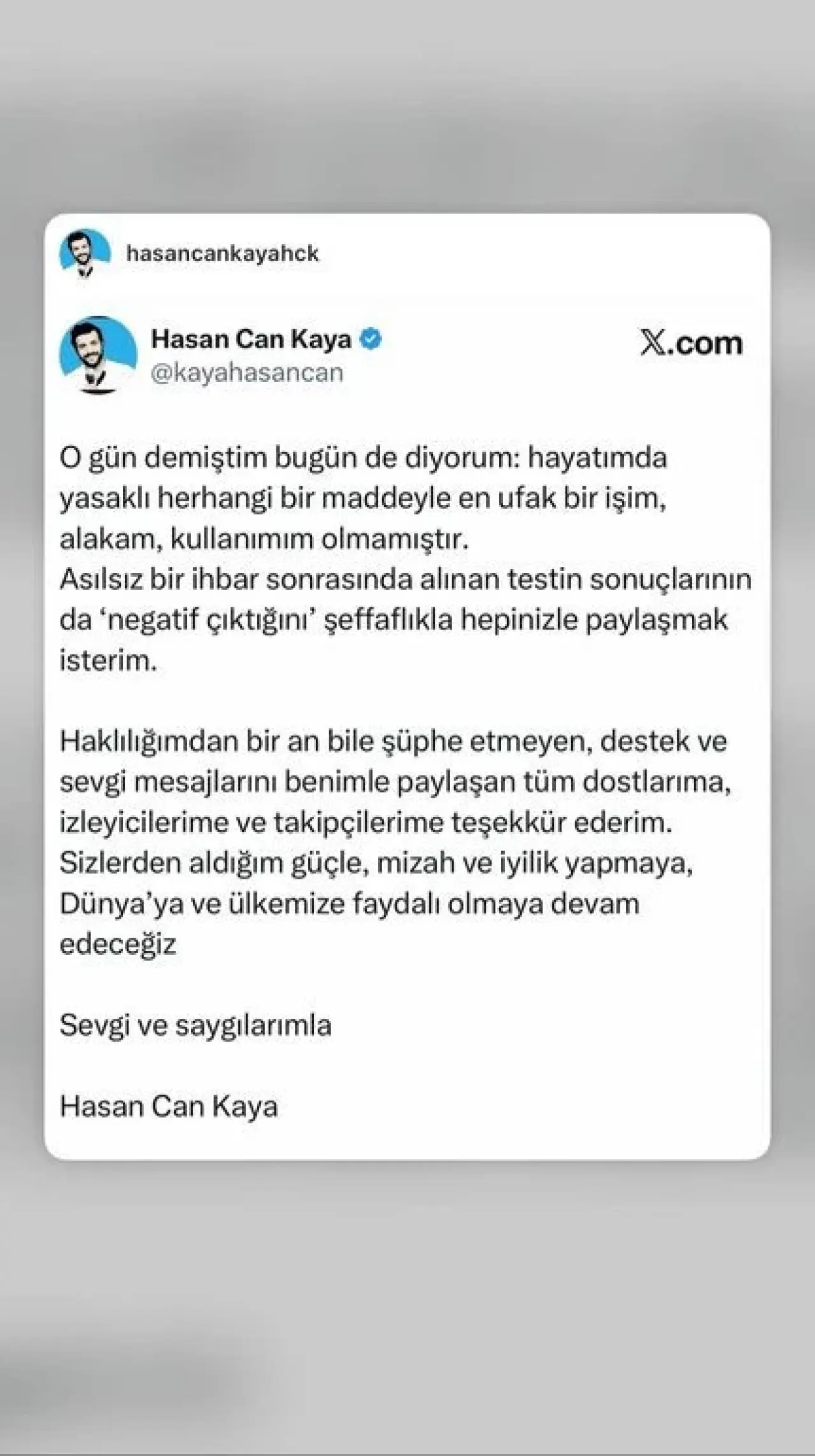 Ünlü komedyen açıklamasında, asılsız bir ihbar sonrası alınan testlerin sonucunun da bu durumu doğruladığını belirterek, kendisine destek veren izleyicilerine ve takipçilerine teşekkür etti. Kaya, bundan sonra da mizah üretmeye ve topluma faydalı işler yapmaya devam edeceğini ifade etti.