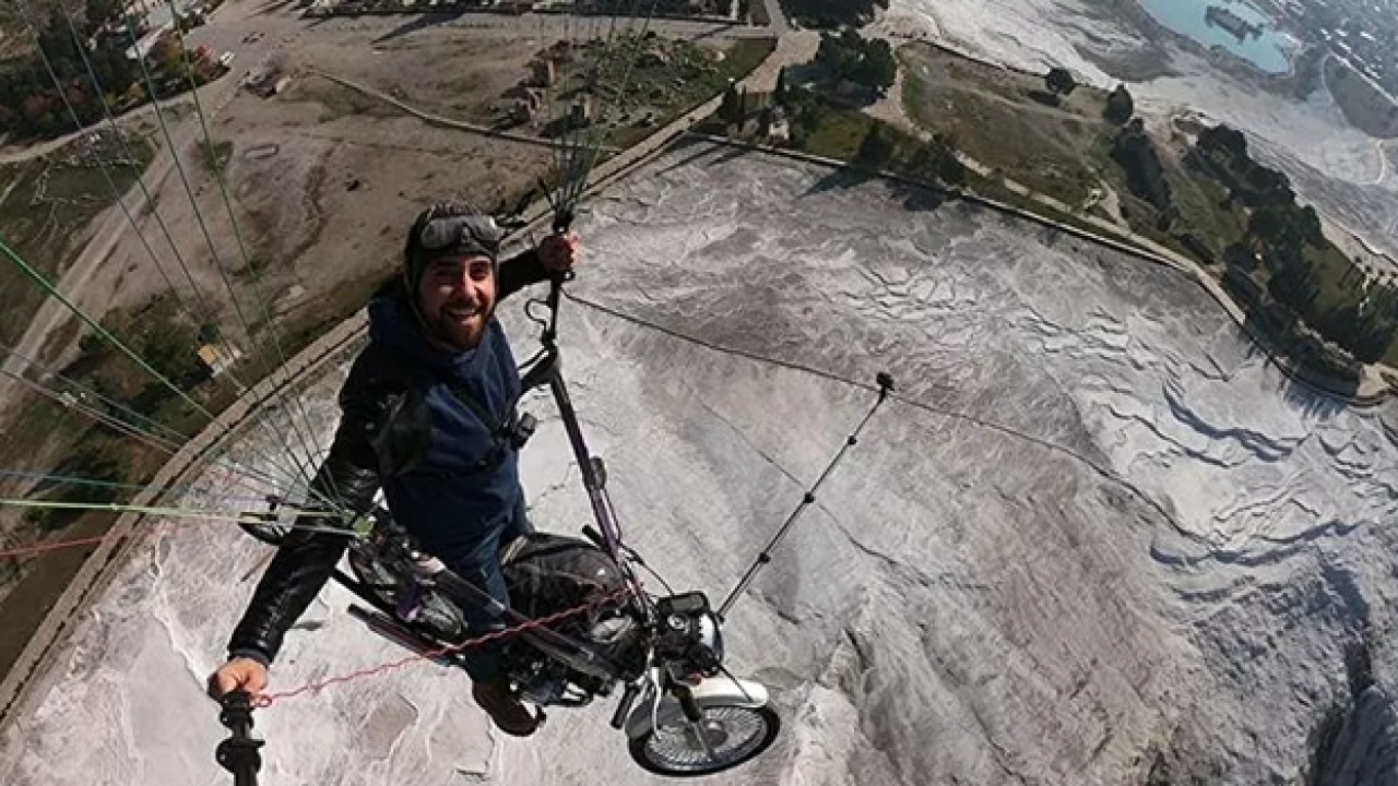 Paraşüte bağladığı motosiklete binerek havalanan Kaval, yaklaşık 20 dakika süren uçuşunda travertenlerin üzerinde aksiyon kamerasıyla kayıt yaptı ve Kocaçukur mevkiine indi.