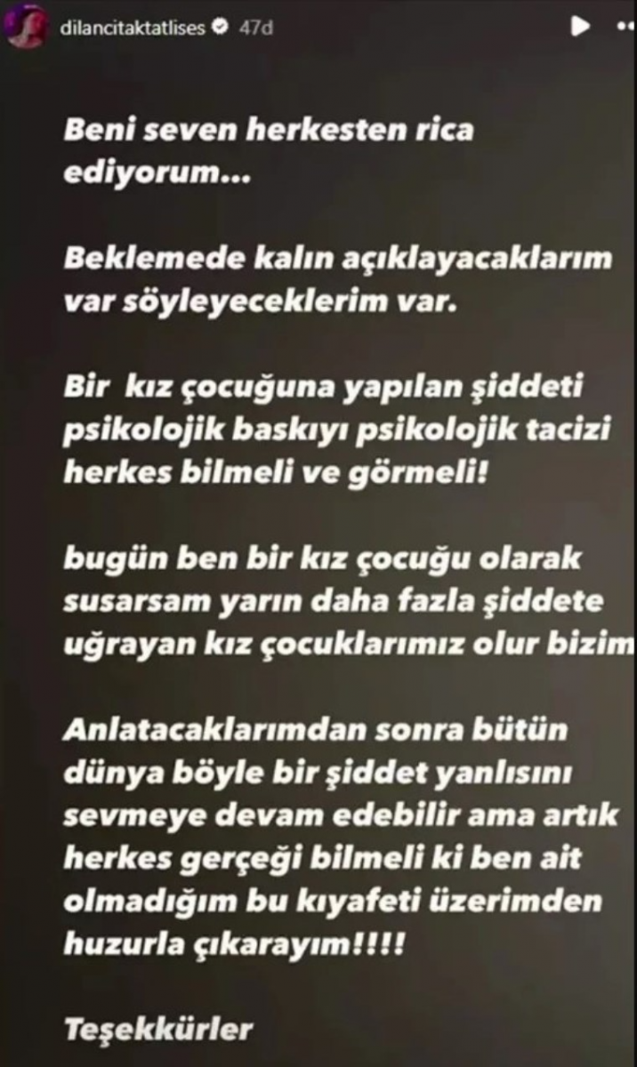 Dilan Çıtak Tatlıses, isim vermeden yaptığı paylaşımda, kız çocuklarına yönelik şiddeti ve psikolojik tacizi herkesin bilmesi gerektiğini vurgulayarak, susmanın gelecekte daha fazla mağdur yaratabileceğini belirtti.
