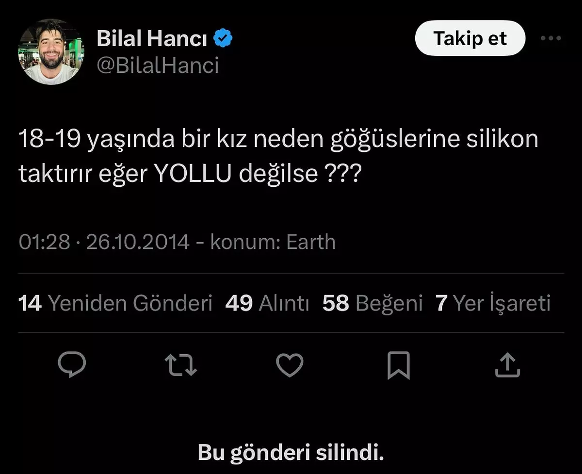 Her yer bu olayla çalkalanırken Bilal Hancı sessizliğini sürdürdü fakat Hancı'nın kendisine ait olduğu iddia edilen eski paylaşımları ortaya çıktı.