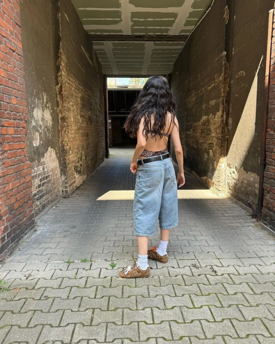 İç çamaşırı benzeri yarı transparan bir üst ve kot şortla sokağa çıkan Hazar Ergüçlü, altına da beyaz spor çorap ve kışlık ayakkabı tercih etti.