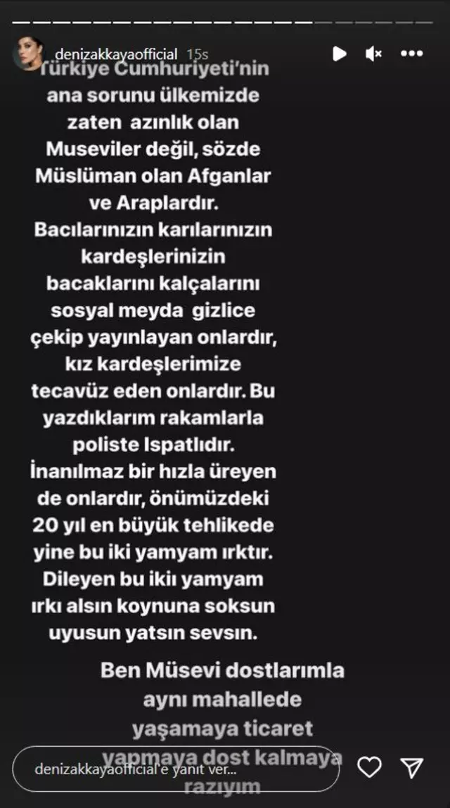 Akkaya daha sonraki paylaşımında ise "Türkiye Cumhuriyeti'nin ana sorunu ülkemizde zaten azınlık olan Museviler değil sözde müslüman olan Afganlar ve Araplardır. Bacılarınızın, kardeşlerinizin, karılarınızın bacaklarını, kalçalarını sosyal medya gizlice çekip yayınlayan onlardır, kız kardeşlerimize tecavüz eden onlardır. Bu yazdıklarım rakamlarla poliste ispatlıdır" dedi.