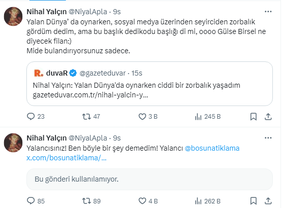 Yalçın, "Yalan Dünya’ da oynarken, sosyal medya üzerinden seyirciden zorbalık gördüm dedim, ama bu başlık dedikodu başlığı di mi, oooo Gülse Birsel ne diyecek filan:)