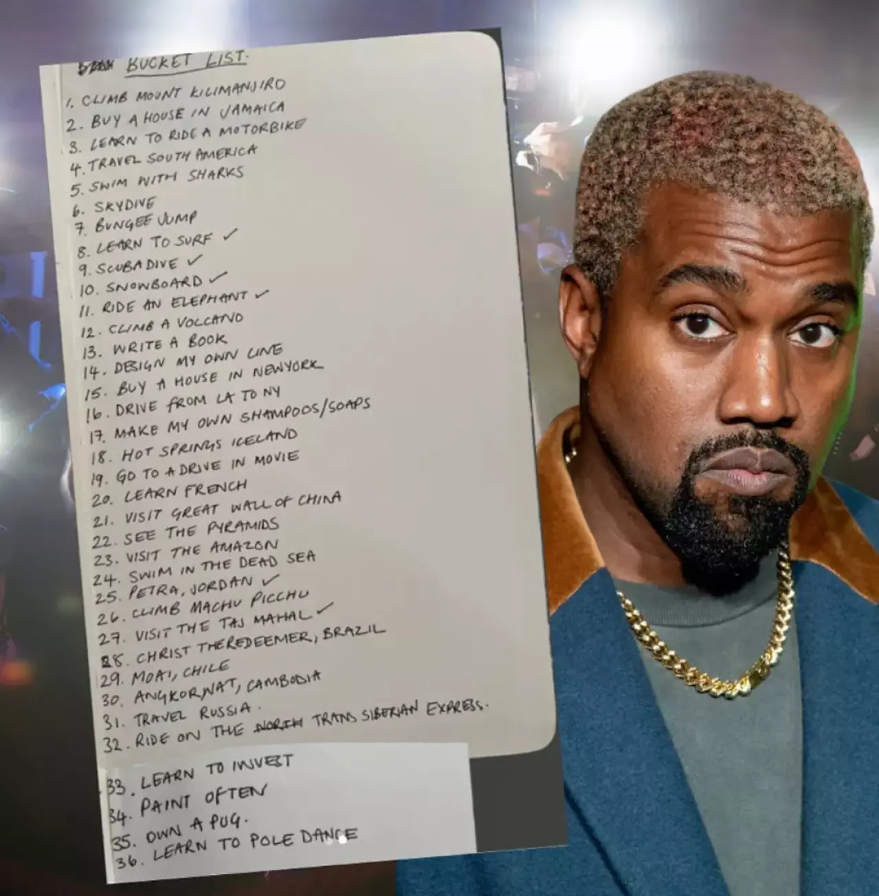 Paylaşılan listede Kanye West’in ölmeden önce yapmak istediği 36 madde yer alıyor. Rusya’dan Brezilya’ya, Çin Seddi’nden Machu Picchu’ya uzanan geniş bir dünya turu planı dikkat çekerken; köpekbalıklarıyla yüzmek, bungee jumping yapmak ve “pole dance (direk dansı) öğrenmek” gibi maddeler sosyal medyada en çok konuşulan başlıklar arasında yer aldı.
