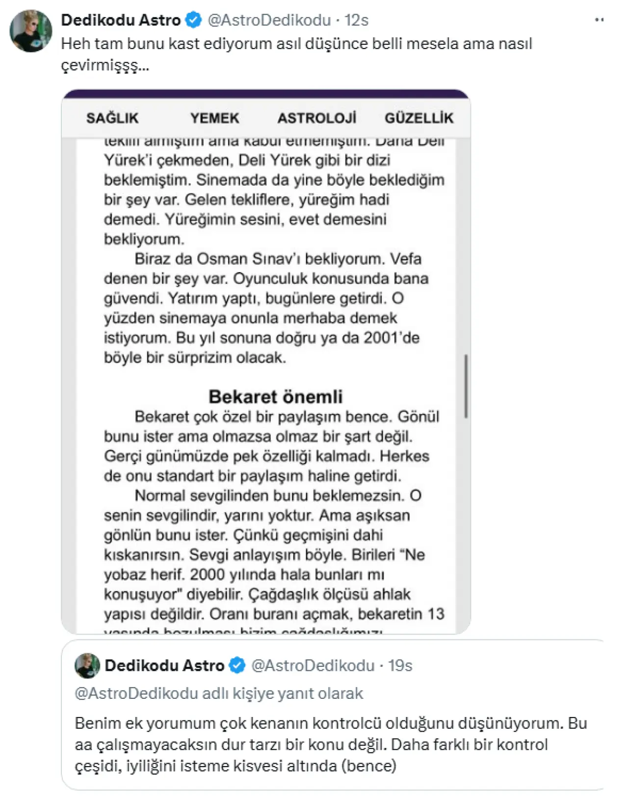 “Bekaret önemli. Bekaret çok özel bir paylaşım bence. Gönül bunu ister ama olmazsa olmaz bir şart değil. Gerçi günümüzde pek özelliği kalmadı. Herkes de onu standart bir paylaşım haline getirdi. Normal sevgilinden bunu beklemezsin. O senin sevgilindir, yarını yoktur. Ama aşıksan gönlün bunu ister. Çünkü geçmişini dahi kıskanırsın.”