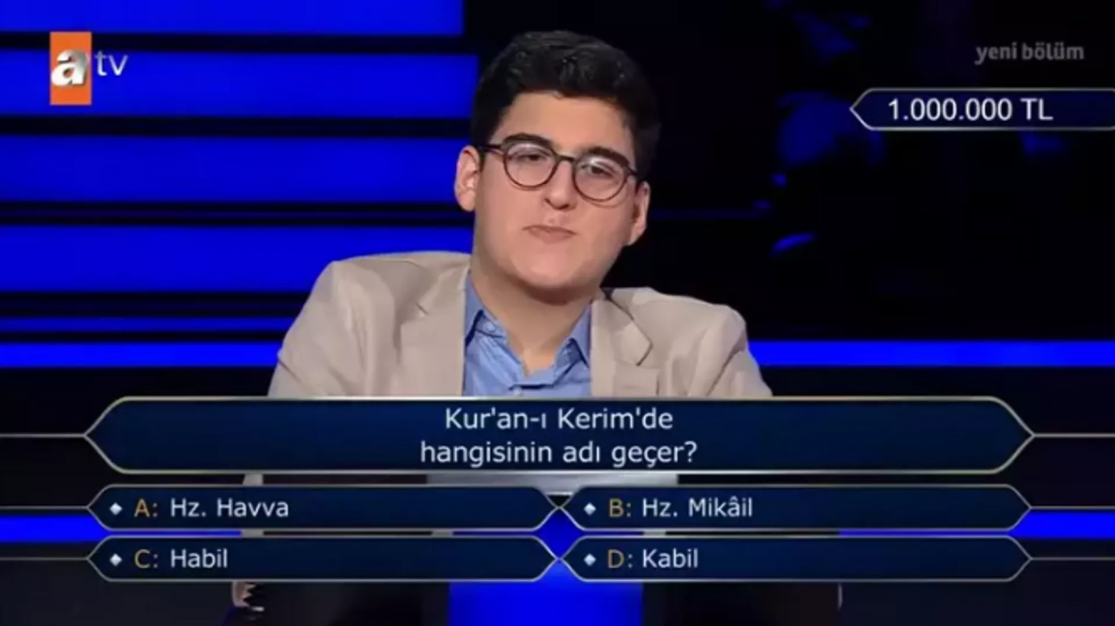 "Kur'an-ı Kerim'de hangisinin adı geçer?" Şıklar arasında Hz. Havva, Hz. Mikail, Habil ve Kabil bulunuyordu. Çulha'nın tercihi Hz. Havva olurken, doğru cevap B şıkkındaki Hz. Mikail'di.