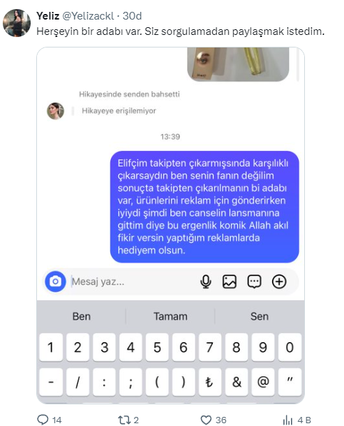 Bunun üzerine paylaşım yapan Açıkel, “Ürünlerini reklam için gönderirken iyiydi şimdi ben Cansel'in lansmanına gittim diye bu ergenlik komik. Allah akıl fikir versin” diyerek tepki gösterdi.