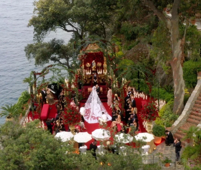 Seremoni için hazırlanan bölüme gelen gelin ve damat, Portofino’nun yamaçlarındaki Castello Brown Kalesi’nde özel bir düğüne imza attı.
