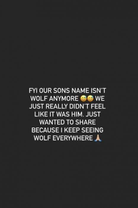 24 yaşındaki Amerikalı yıldız, haberi dün sosyal medya hesabından bir paylaşım yaparak, “Oğlumuzun adı artık Wolf (Kurt) değil bilginize. Bu isimle kendisi gibi hissetmediğini düşündük. Her yerde bu ismi gördüğüm için sizinle de paylaşmak istedim” notuyla duyurdu.