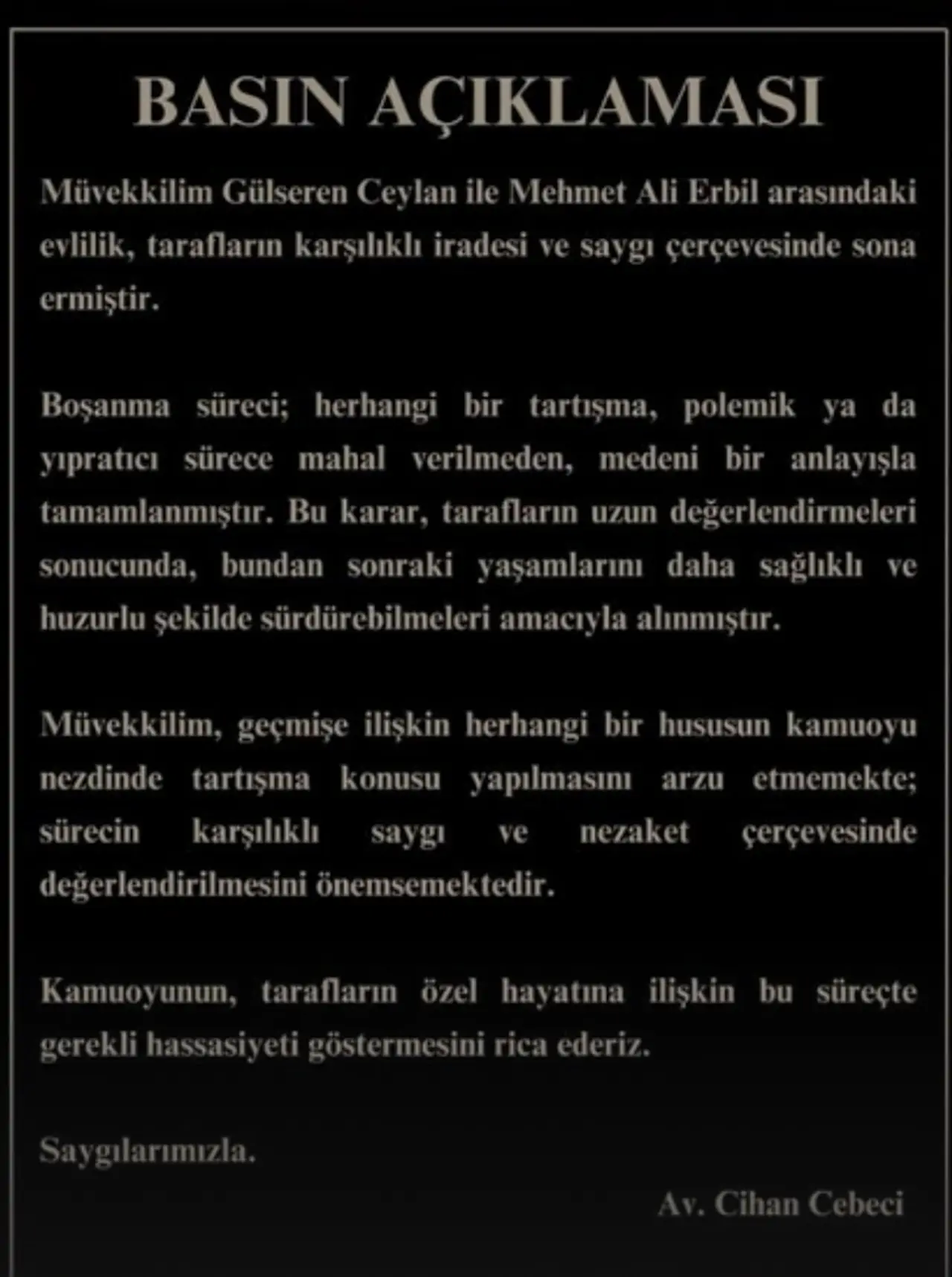 Gülseren Ceylan’ın avukatı Cihan Cebeci, müvekkilinin boşanma sürecine dair resmi bir açıklama yaptı. Açıklamada, Ceylan ile Mehmet Ali Erbil’in evliliğinin tarafların karşılıklı iradesi ve saygısı çerçevesinde sona erdiği belirtildi.