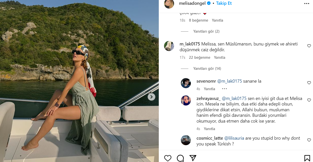 Bir takipçisinin "Melisa, sen Müslümansın, bunu giymek ve ahireti düşünmek caiz değildir." yorumu dikkat çekti.