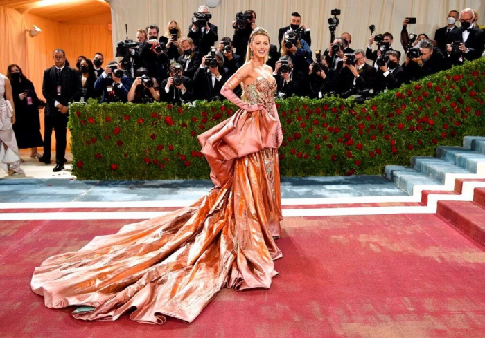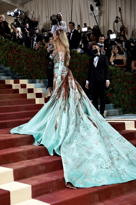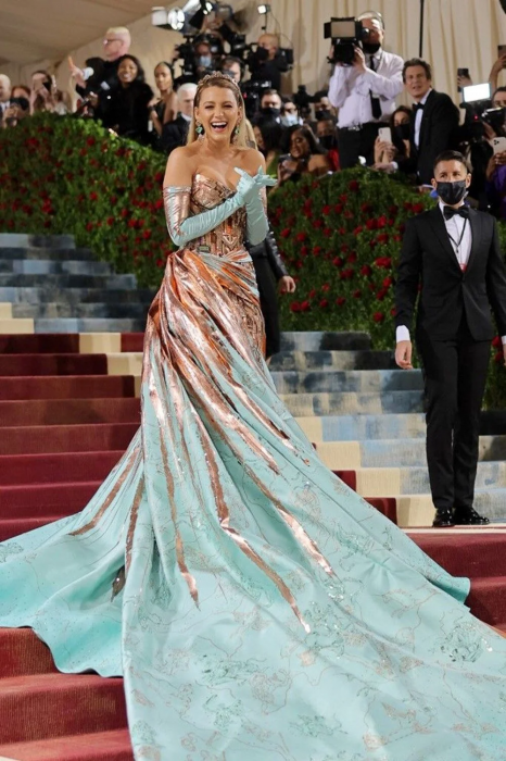 Blake Lively elbisesiyle geceye damga vurdu. Blake Lively'nin elbisesi belindeki fiyonkların çözülmesiyle pembeden maviye döndü.