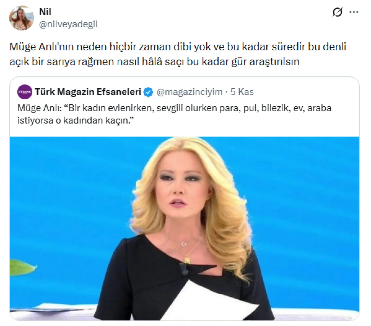 Ünlü sunucu Müge Anlı’nın yıllardır kullandığı açık sarı saç rengi ve saçlarının gürlüğü sosyal medyada tartışma yaratırken, kullanıcıların yaptığı yorumlar gündeme damga vurdu.