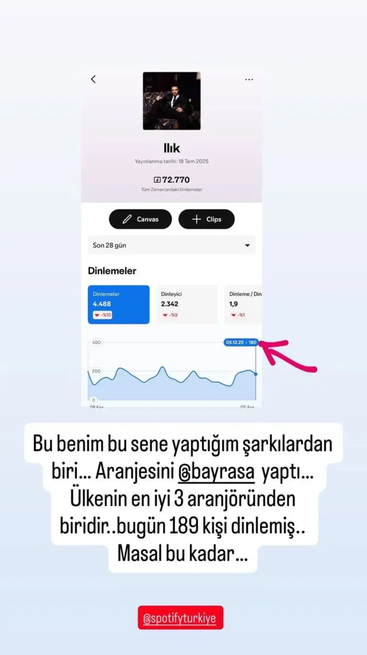 Sanatçı, bu yıl yayınladığı “Ilık” şarkısının Spotify’daki dinlenme sayısından duyduğu memnuniyetsizliği de dile getirdi: “Bu benim bu sene yaptığım şarkılardan biri… Bugün 189 kişi dinlemiş… Masal bu kadar…”
