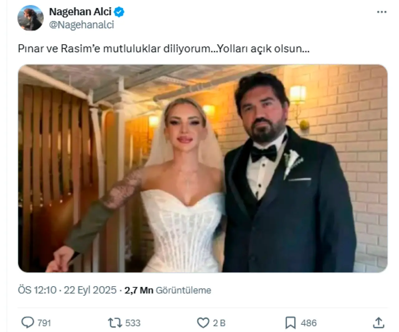 Gazeteci Nagehan Alçı, eski eşi Rasim Ozan Kütahyalı’nın Pınar Ayaz ile evlendiği nikâhta çekilen bir fotoğrafı sosyal medya hesabından paylaştı.