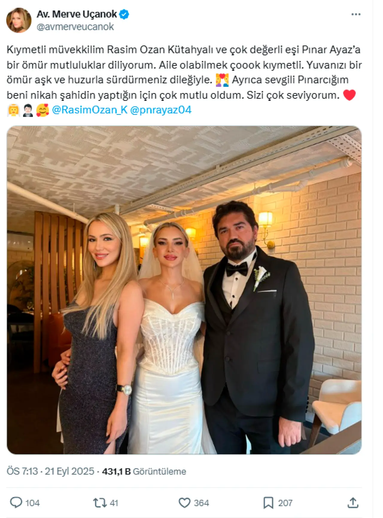 "Kıymetli müvekkilim Rasim Ozan Kütahyalı ve çok değerli eşi Pınar Ayaz’a bir ömür mutluluklar diliyorum. Aile olabilmek çoook kıymetli. Yuvanızı bir ömür aşk ve huzurla sürdürmeniz dileğiyle.  Ayrıca sevgili Pınarcığım beni nikah şahidin yaptığın için çok mutlu oldum. Sizi çok seviyorum."