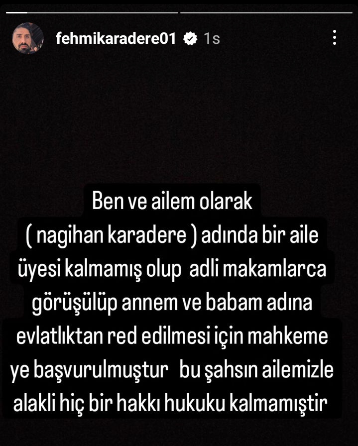 Fehmi Karadere, Nagihan Karadere'nin evlatlıktan reddedilmesi için anne ve babasının mahkemeye başvurduğunu iddia etti.