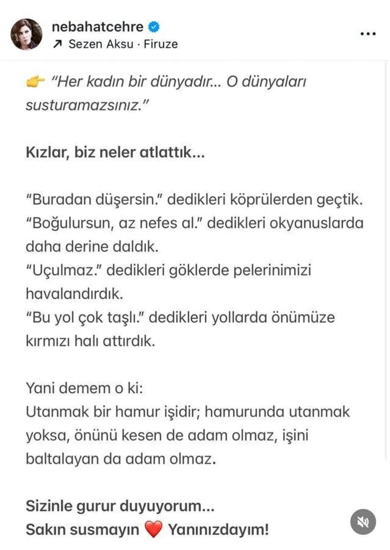 Türk sinemasının usta ismi Nebahat Çehre, son günlerde birçok ünlü hakkında gündeme gelen taciz ifşalarının ardından sessizliğini bozdu. Sosyal medya hesabından yaptığı paylaşımda, kadınların karşılaştığı tüm zorluklara rağmen dimdik durduğunu vurguladı: