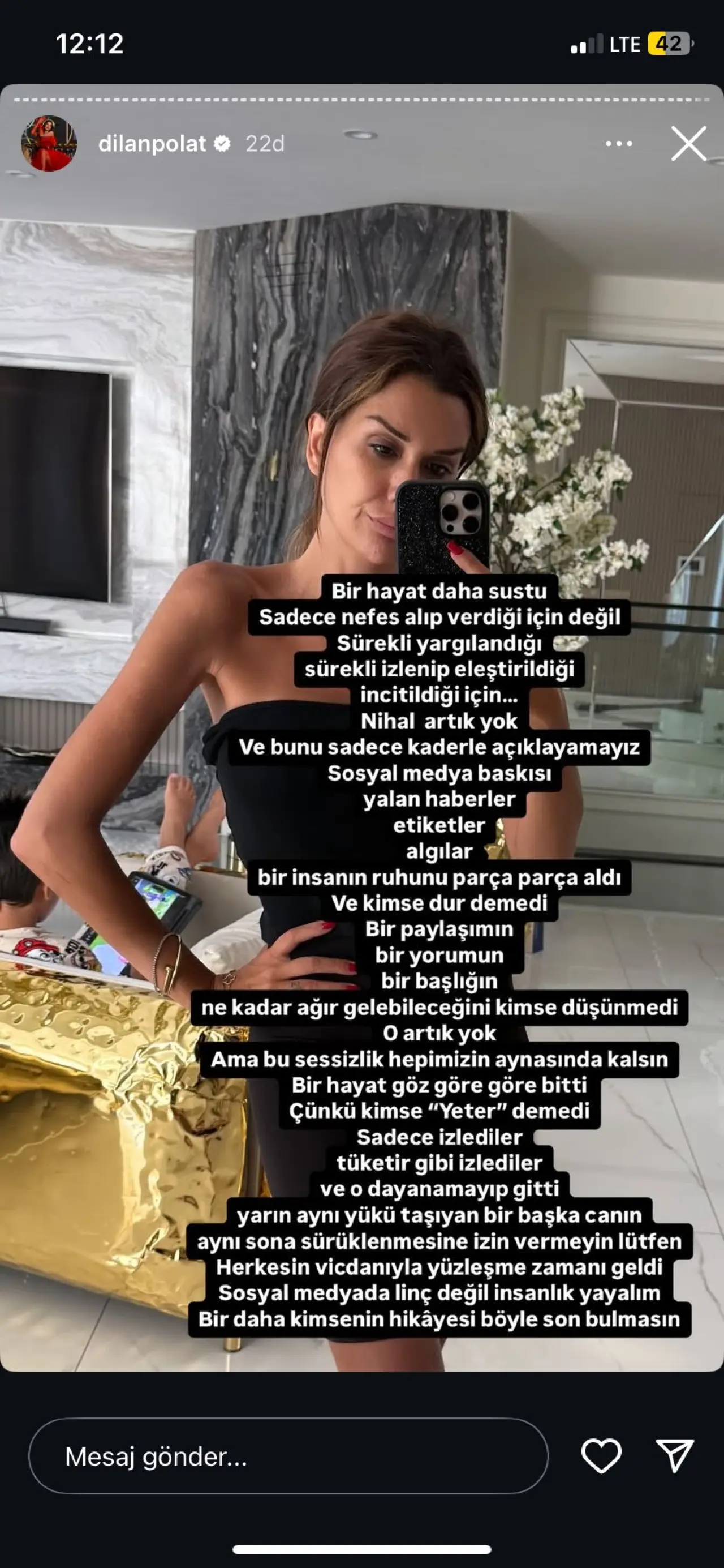 Anoreksiya nedeniyle hayatını kaybeden Nihal Candan hakkında cezaevinden açıklama yapan Dilan Polat, hemen ardından yayınladığı ayna pozu ile sosyal medyada büyük tepki topladı. Kullanıcılar, “Bu mezara girse story atar” yorumlarıyla tepki gösterdi.