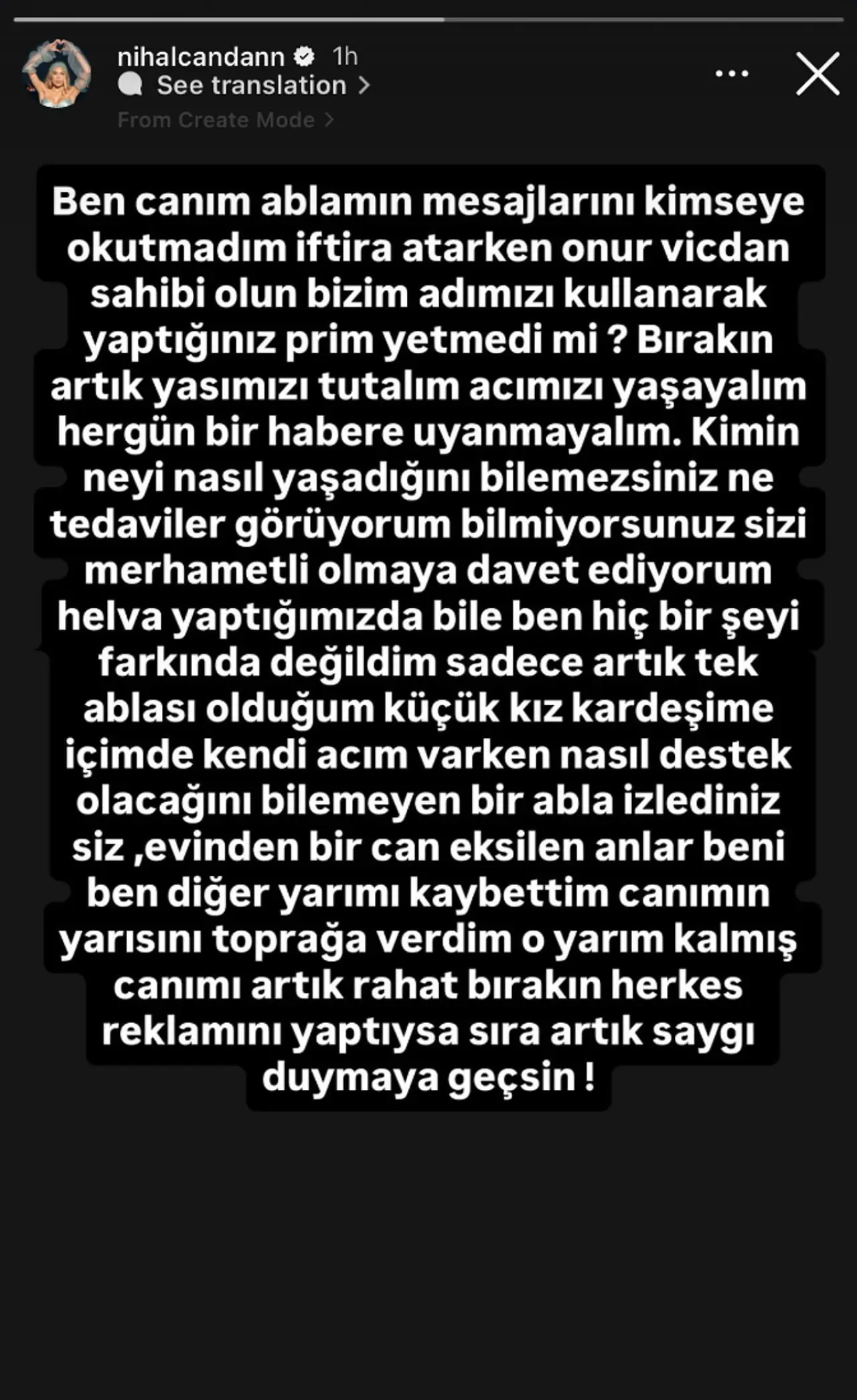 “Ben canım ablamın mesajlarını kimseye okutmadım. İftira atarken onur, vicdan sahibi olun. Bizim adımızı kullanarak yaptığınız prim yetmedi mi? Bırakın artık yasımızı tutalım, acımızı yaşayalım. Her gün bir habere uyanmayalım.”
