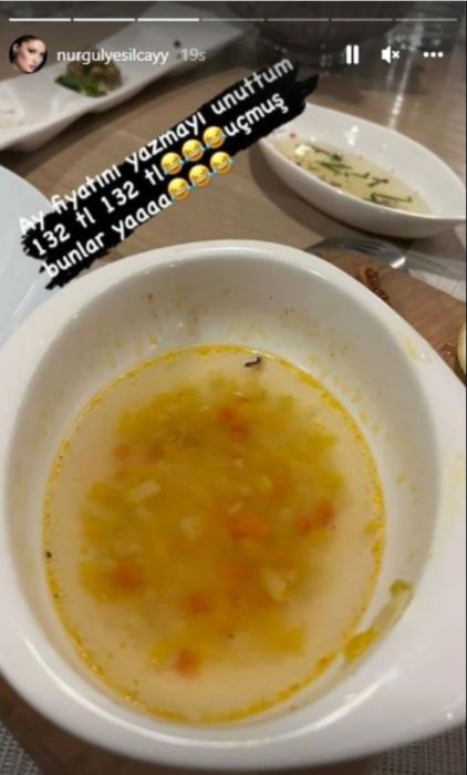 Oyuncu Nurgül Yeşilçay, Bodrum'da gittiği bir restoranda içtiği çorbanın 132 TL olduğunu öğrenince "Uçmuş bunlar ya" diyerek, ödediği ücrete sitem etti.