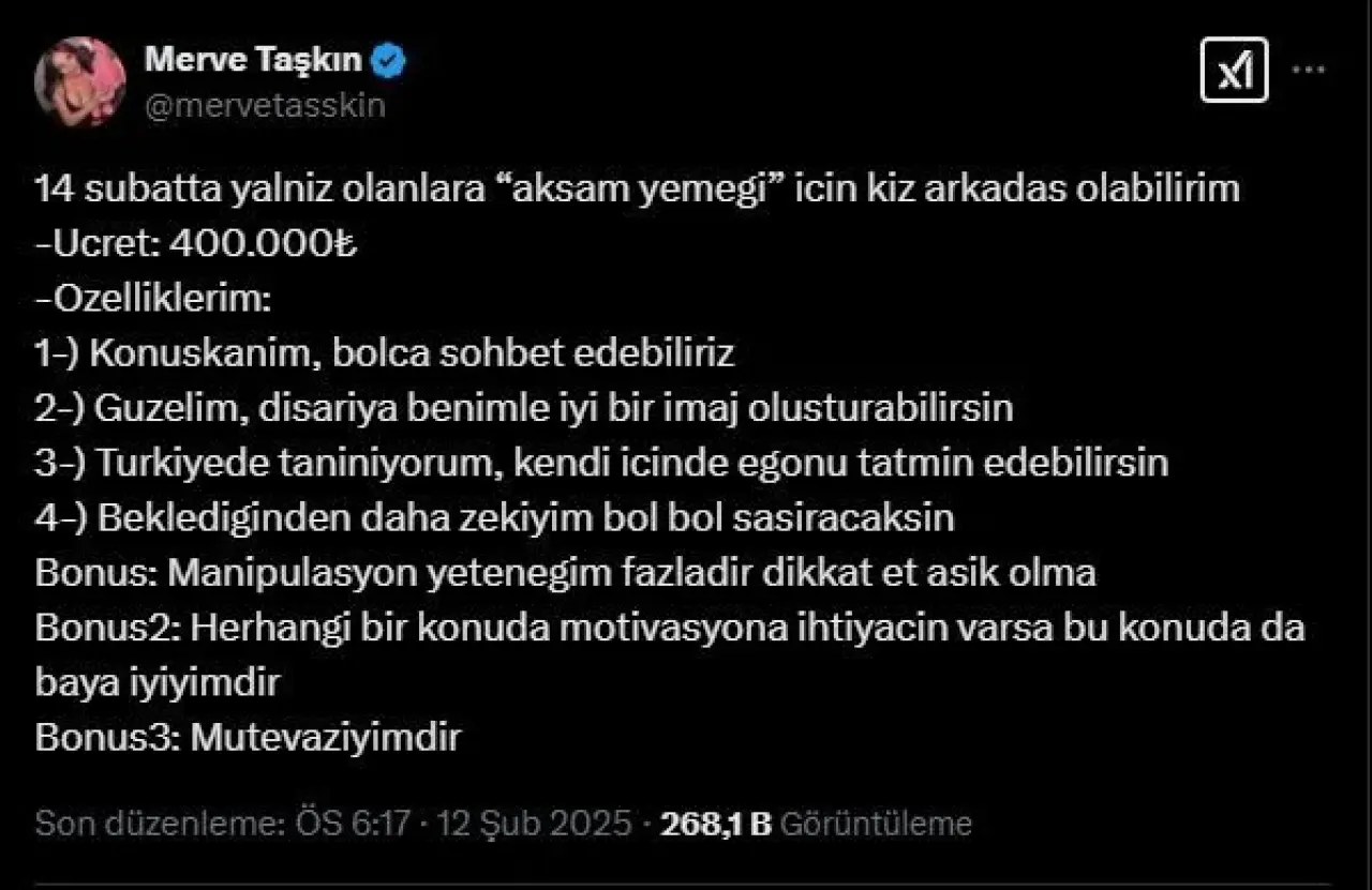 Tuhaf açıklamaları ve sınırları zorlayan fotoğraflarıyla zaman zaman tepki çeken Taşkın, şimdi de 14 Şubat'ta yalnız olanlar için ilan açtı. X hesabında 14 Şubat'ta cinsiyet fark etmeksizin 400 bin TL karşılığında yemek yiyebileceğini söyleyen Taşkın, özelliklerini yazarak ilgi çekmeye çalıştı. Taşkın'ın teklifi kısa sürede gündem oldu.
